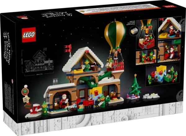 L’ufficio postale innevato ospita lo studio di Babbo Natale completo di uno scoppiettante caminetto, un’area di smistamento postale, un ingresso con una macchina per il caffè e un’area di scrittura al secondo piano con uno scivolo per le lettere. Gli altri modelli includono una mongolfiera con bruciatore che si illumina, uno smistatore di lettere a 2 vie, una scena di pesca sul ghiaccio, albero di Natale, cartello, cassetta delle lettere e slitta, più una minifigure di Babbo Natale e 4 elfi.